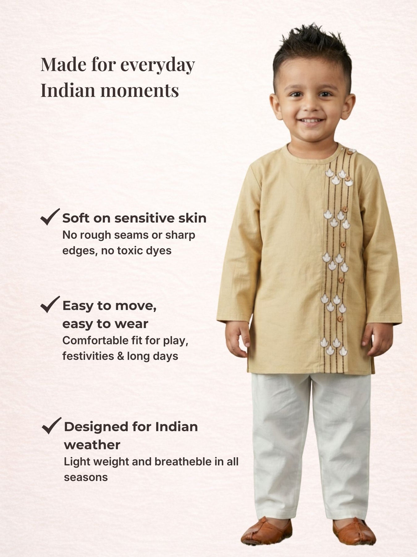 Introduce your child to the enchanting charm and unmatched comfort of our Kurta Pajama Set. At Popoz, we specialize in creating clothing that not only looks magical but also feels wonderful to wear. Crafted with reinforced seams and high-quality stitching, this set is designed to endure the daily adventures of childhood while keeping its elegant appearance.