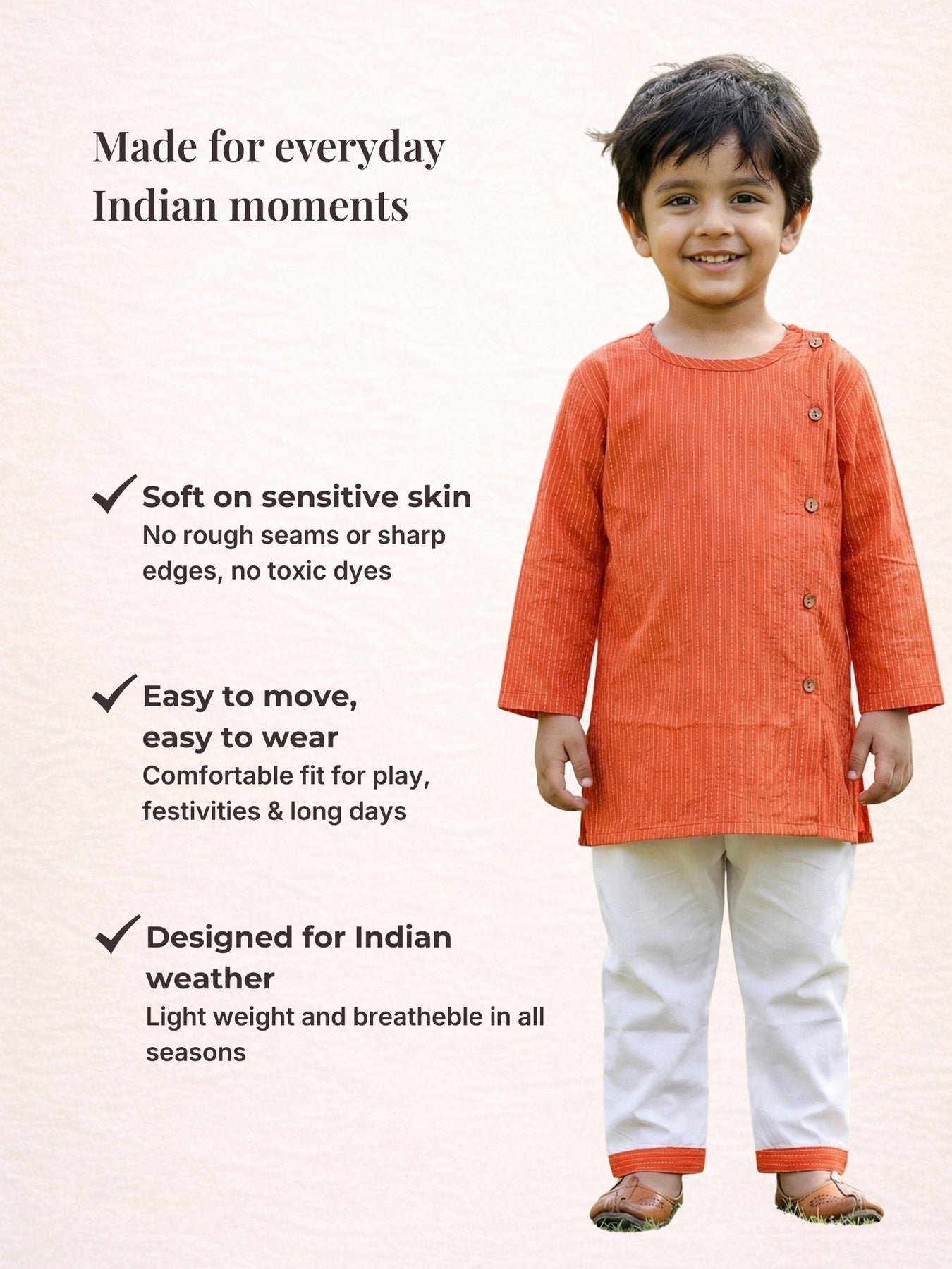 SEO Description: Orange side-button kurta pajama set for kids with katha stripes. Cotton festive ethnic wear, ideal for weddings, birthdays & cultural events.