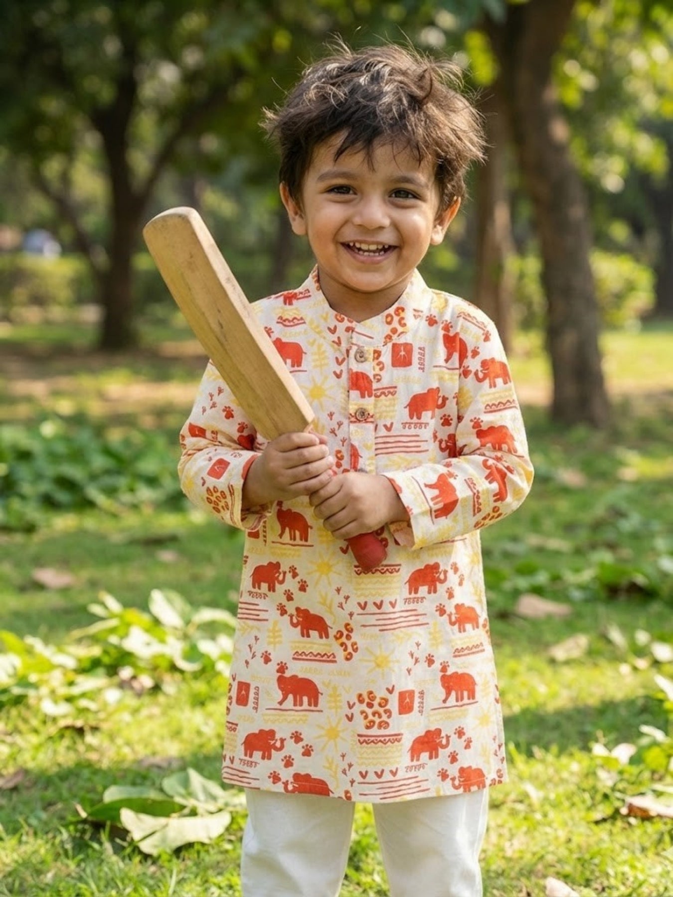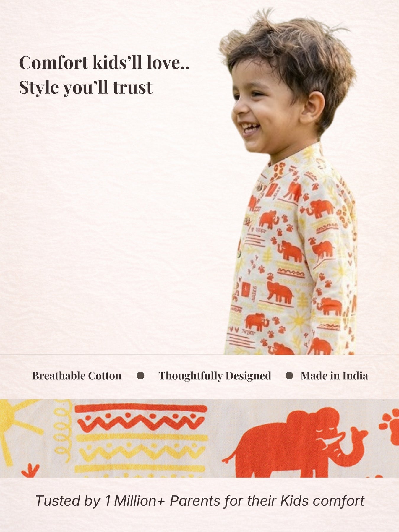 Make every day playful with the Elephant Motif Kurta Pajama Set from Popoz by Desi Soota. The cheerful elephant prints on a neutral background are sure to bring smiles and stories to life.