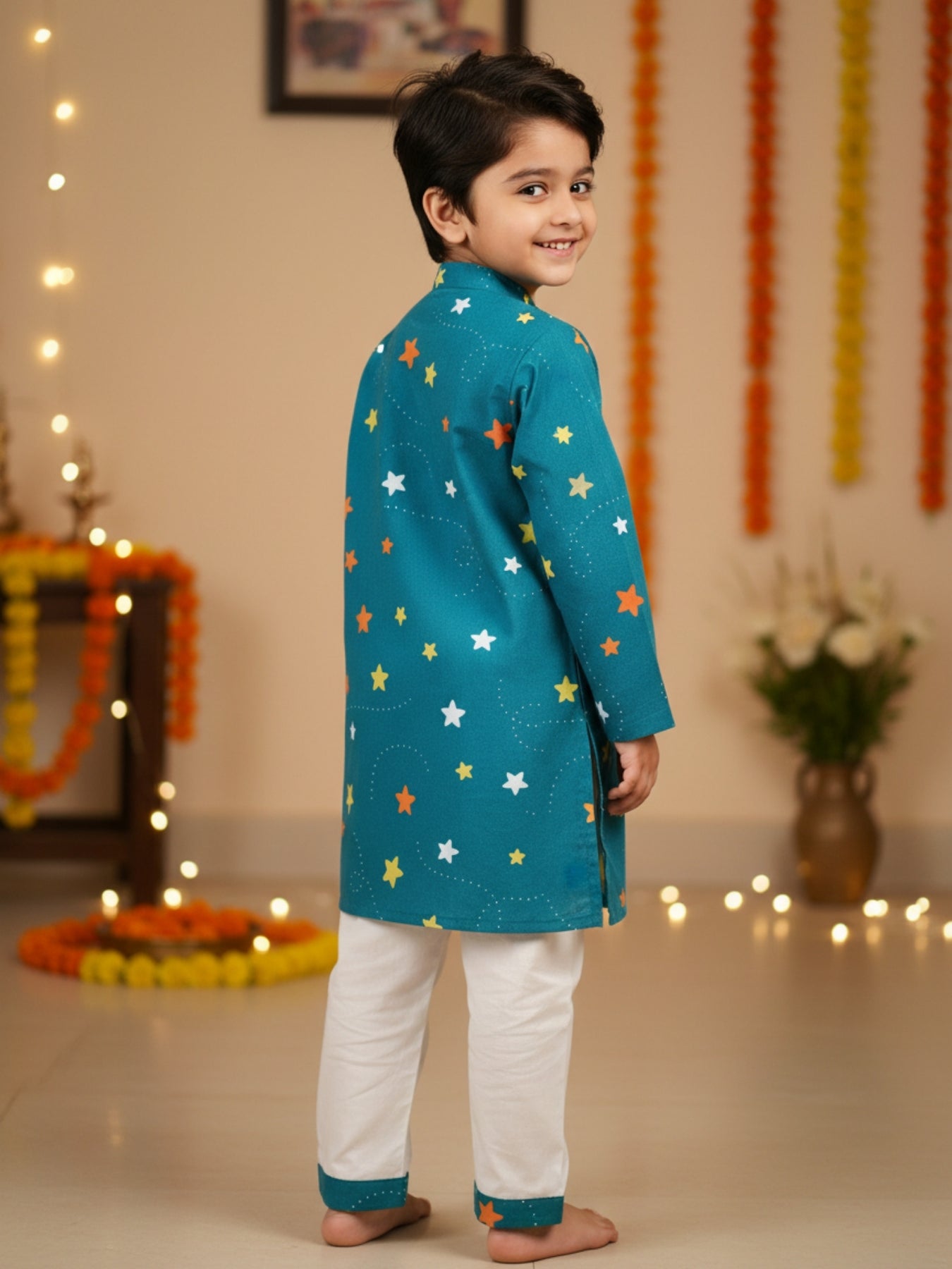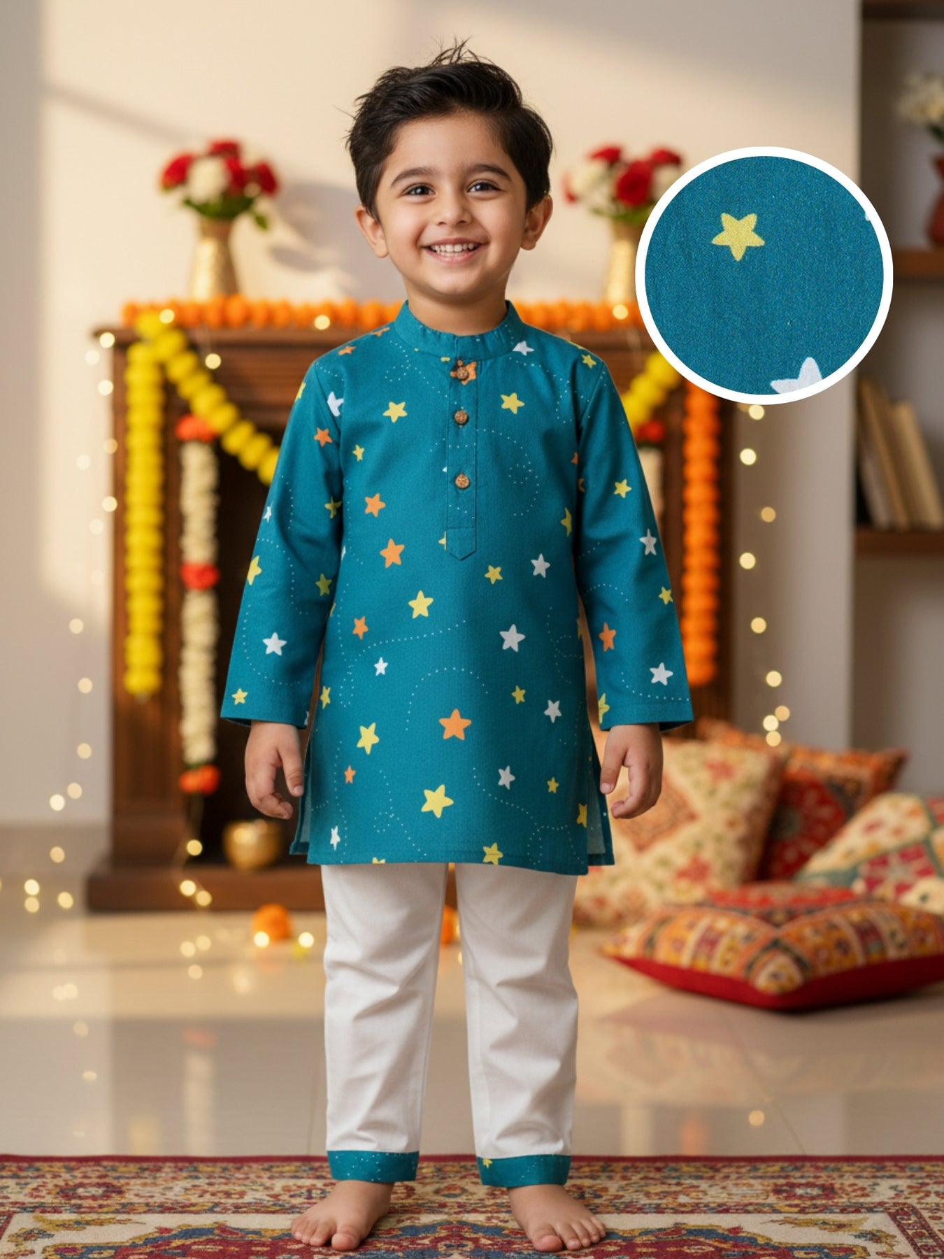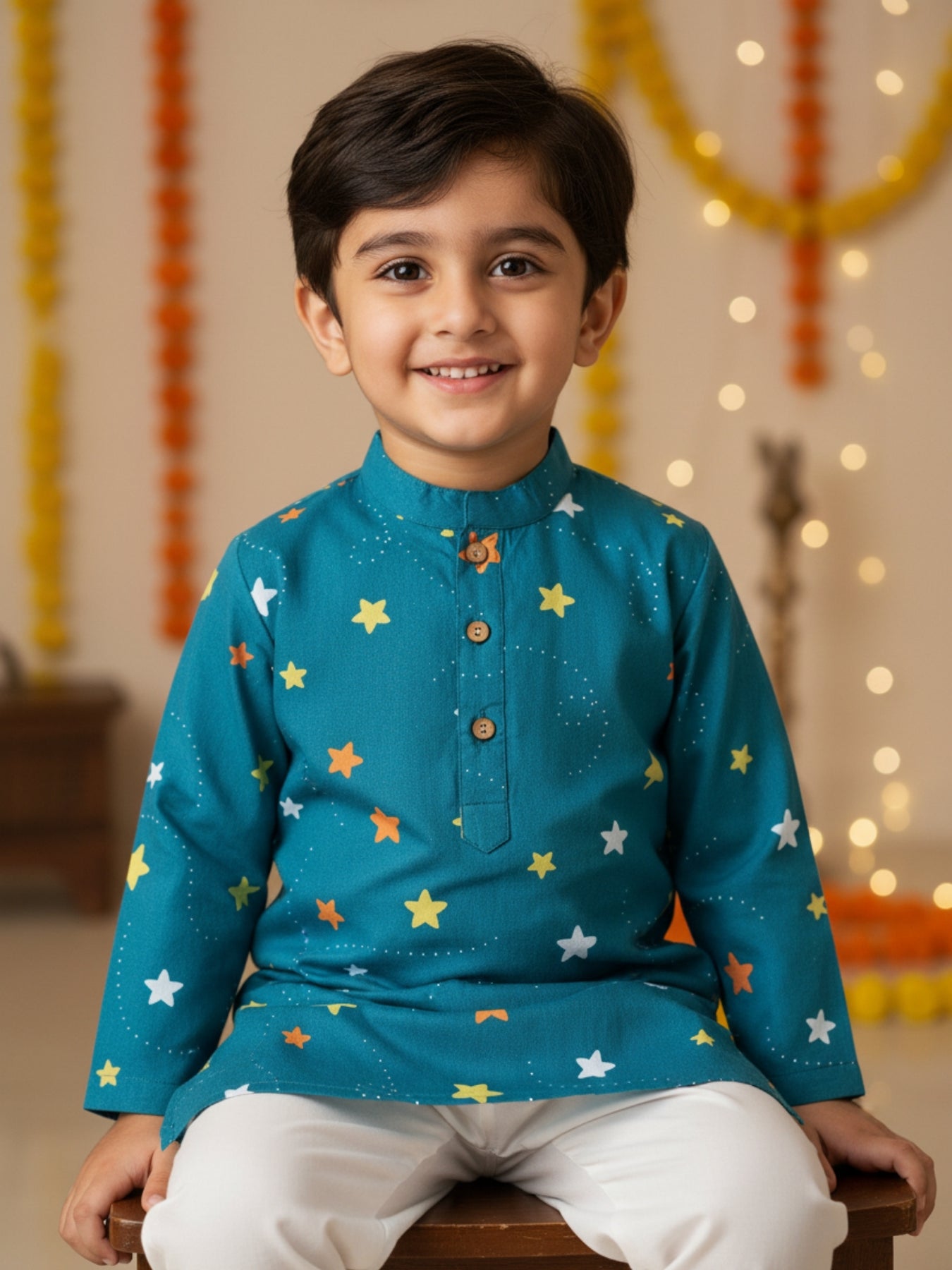 Kurta: Full sleeve, mandarin collar, teal base with multicolored star motifs