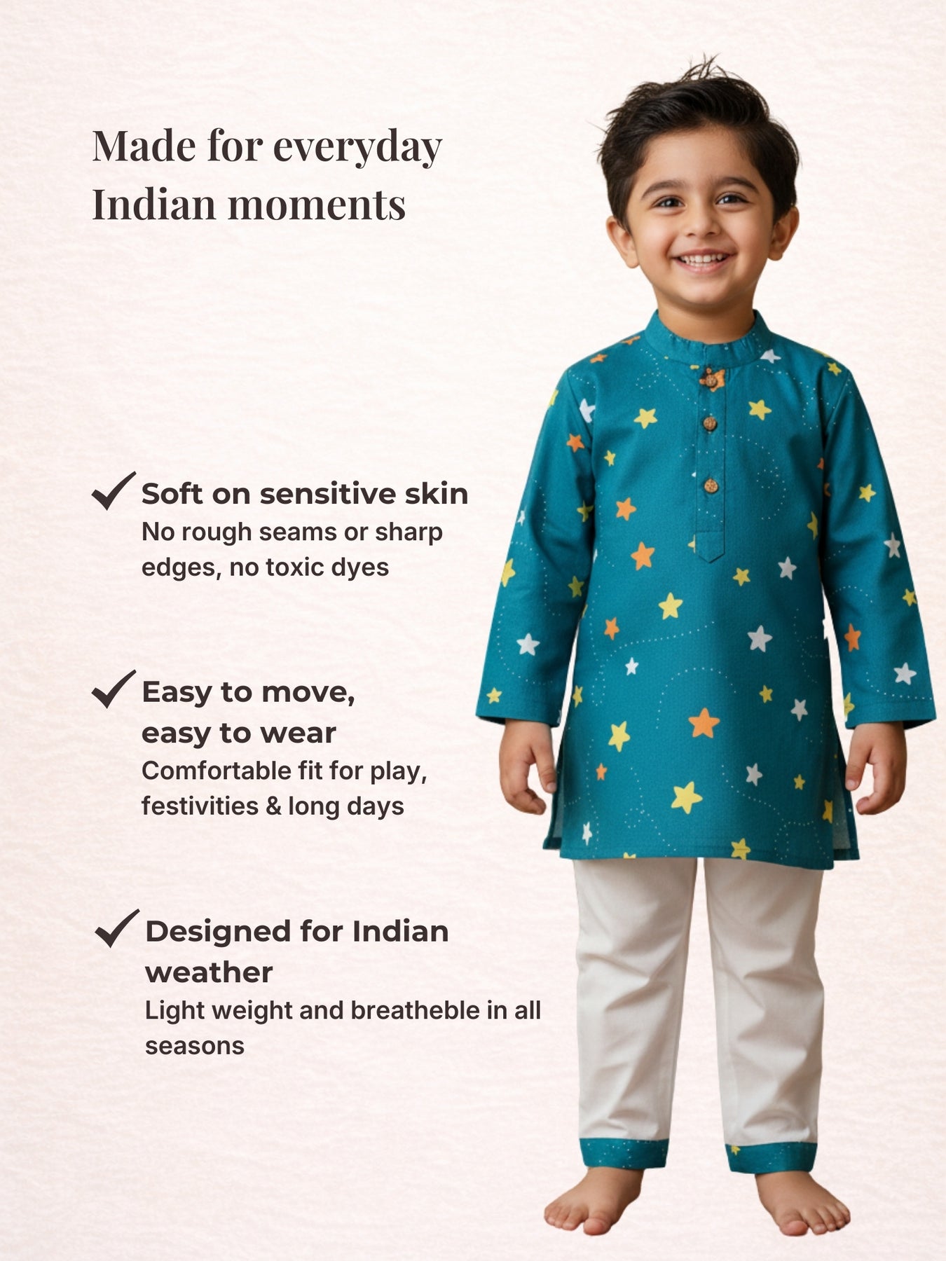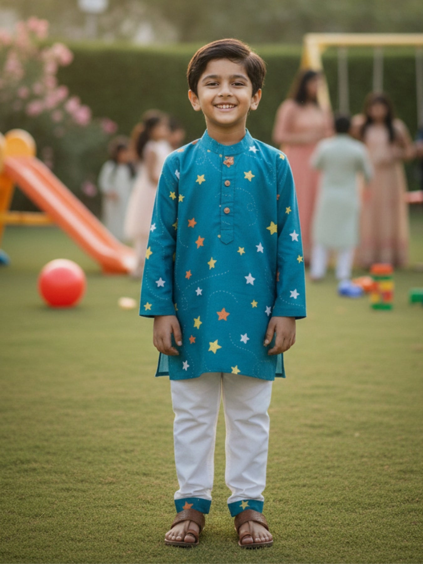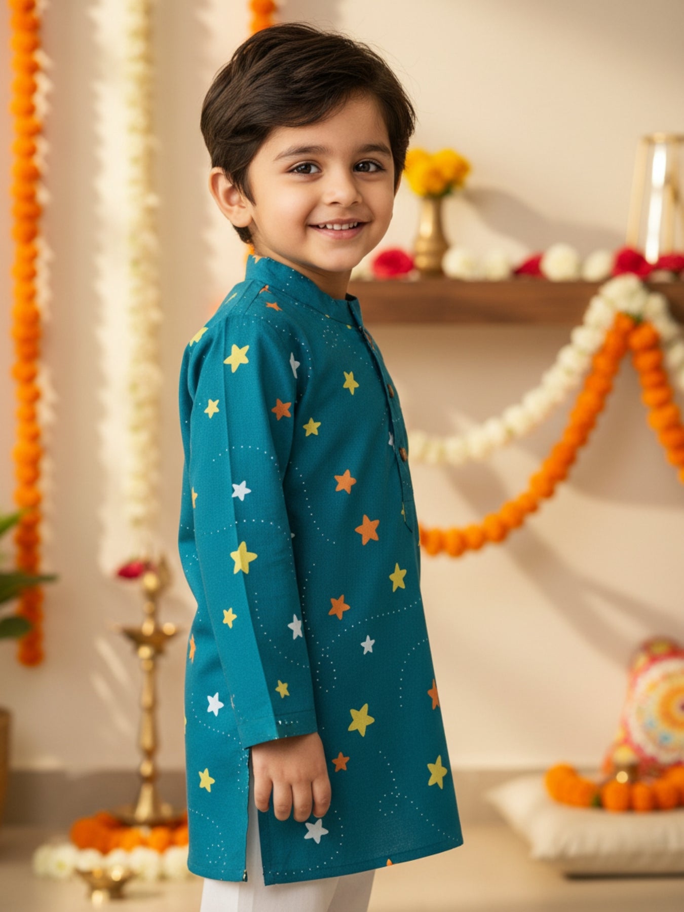 Kurta: Full sleeve, mandarin collar, teal base with multicolored star motifs