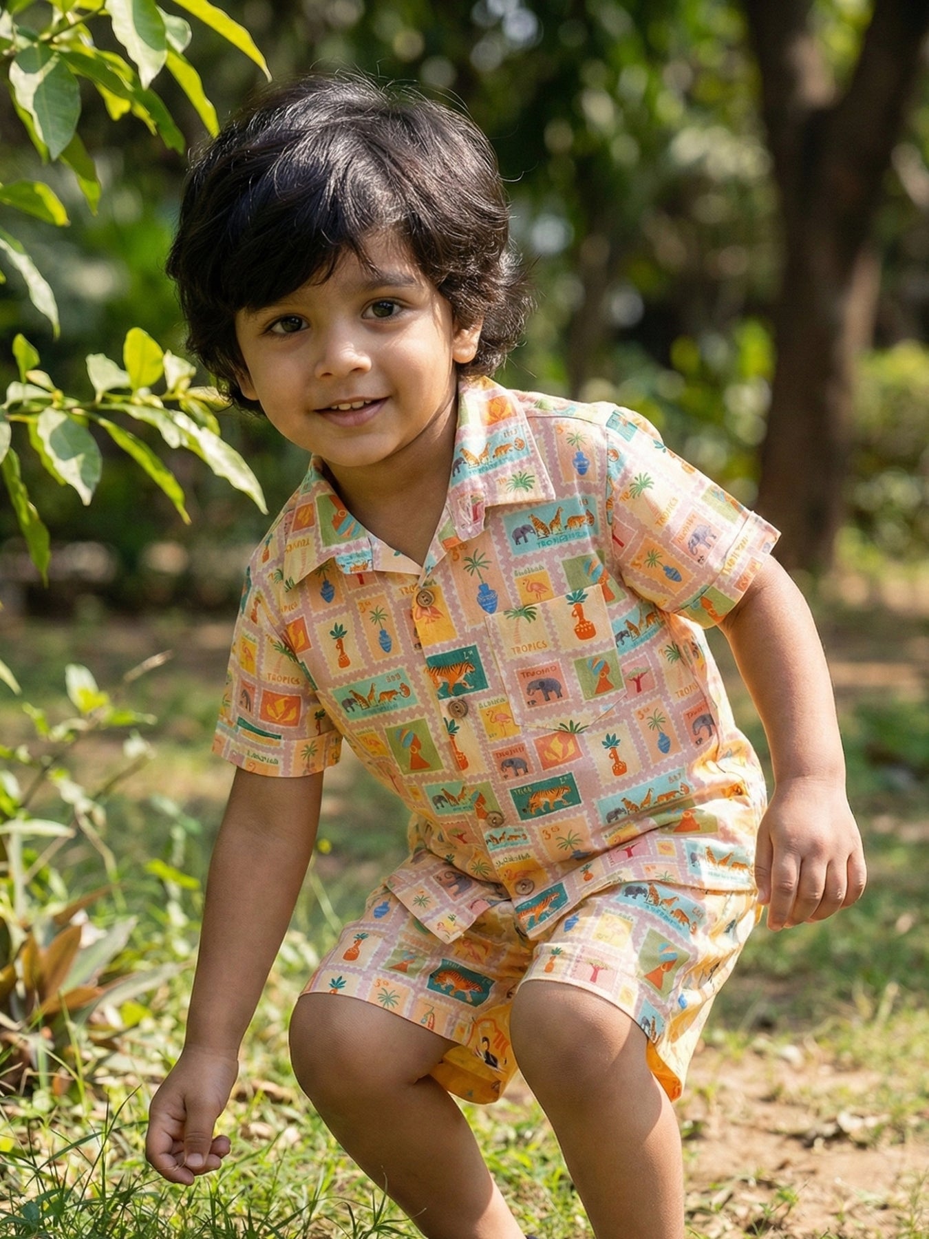 Crafted from breathable 100% cotton, the half-sleeve shirt comes with a smart collar, wooden button closure, and a relaxed silhouette. The matching elasticated shorts ensure unrestricted movement, making this coord set perfect for active days and sunny outings.