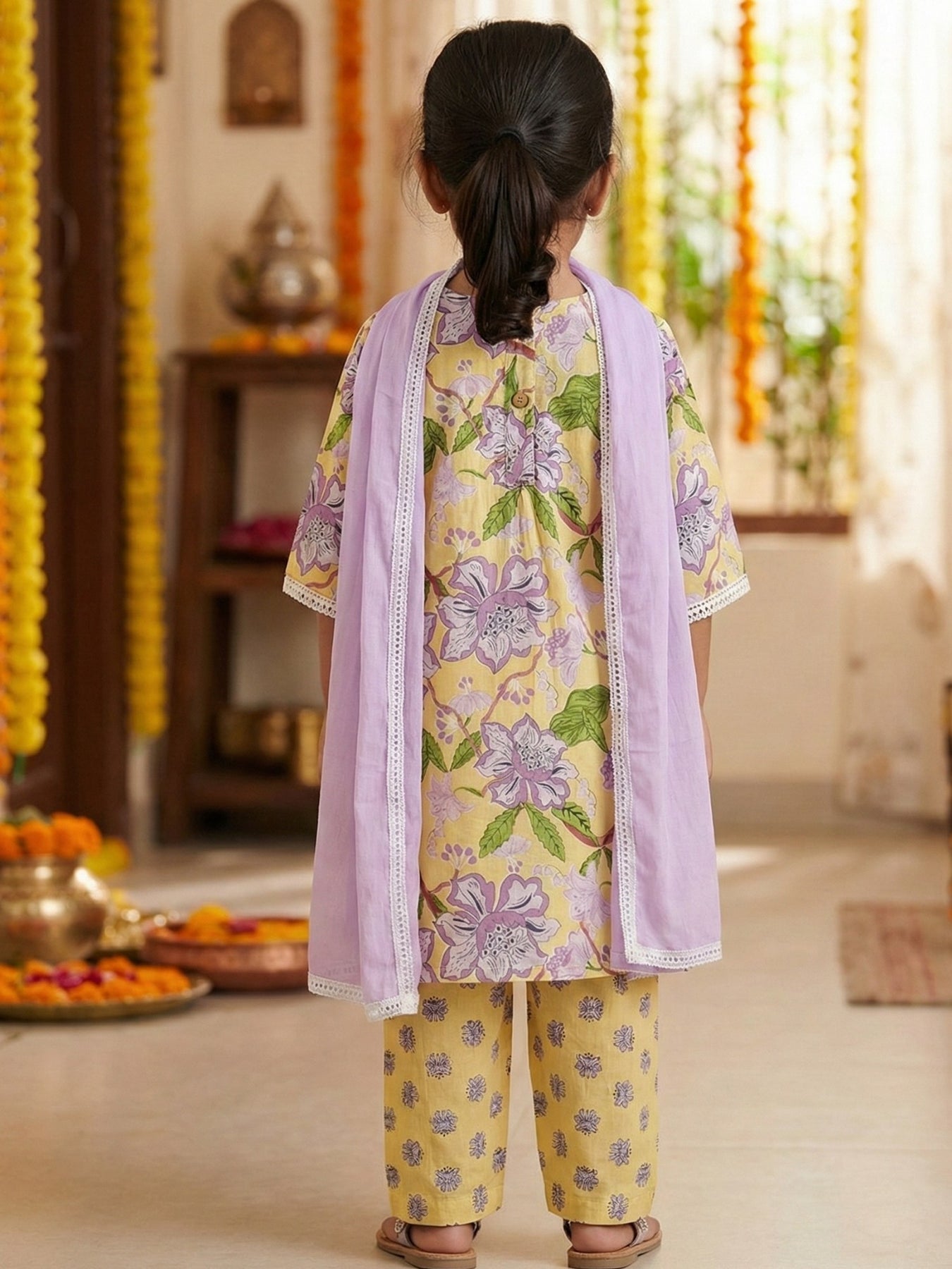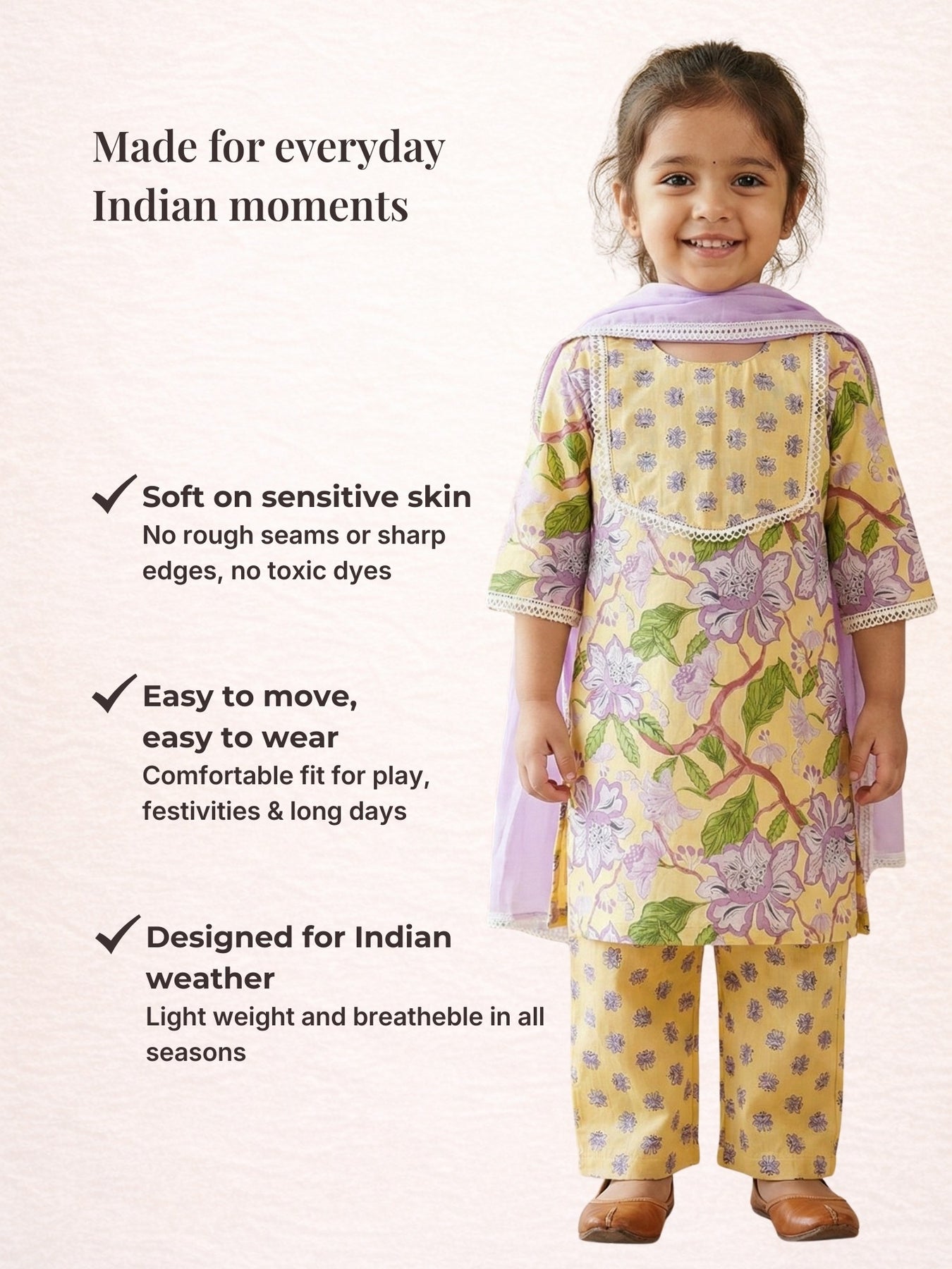 Bring sunshine and charm with the Yellow & Lavender Floral Kurti Pajama Set with Dupatta from Popoz by Desi Soota. The pastel tones and floral detailing make it a festive favorite.